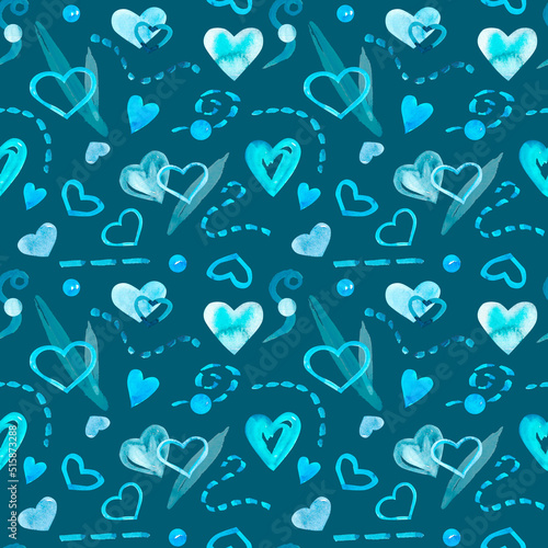 Watercolor seamless hand-drawn trendy pattern in denim colors. Abstract art with blue hearts for textile.