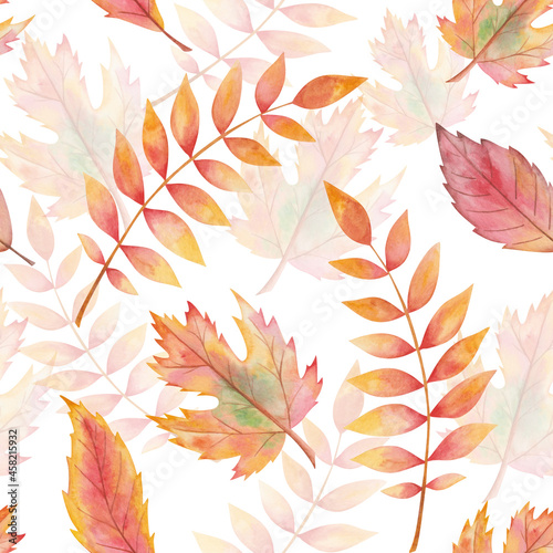 Watercolor seamless pattern from hand painted illustration of tree leaves in autumn yellow and red colors isolated on white. Forest nature print for fall season fabric textile, design cards, packaging