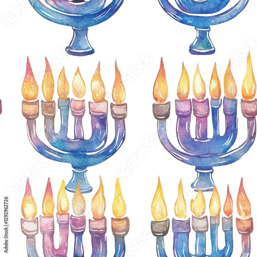 Watercolor seamless pattern of Hanukkah menorahs, isolated on a white background, merging color and elegance. PNG
