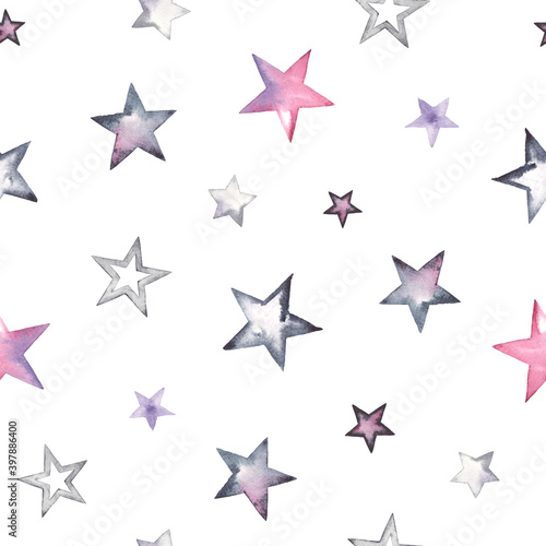 Watercolor seamless pattern with colorful stars pink, grey, black colors on white background. Holiday illustration for wallpapers print, wrapping paper or textile.
