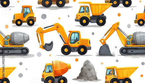 Watercolor seamless pattern with kid construction toys illustrations. Yellow tractor, truck, cement mixer, excavator, dump truck, construction machinery. Nursery decor, fabric design, wrapping paper,