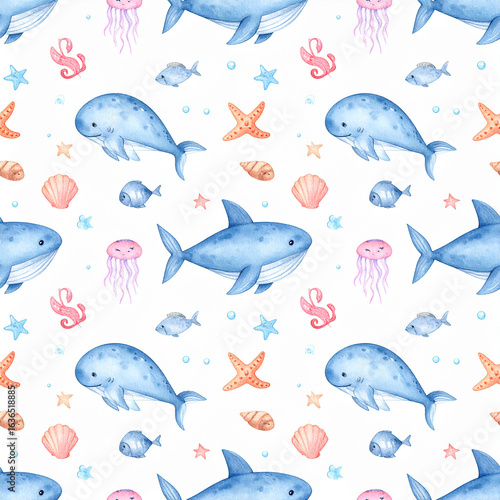 Watercolor seamless pattern with underwater world Bright fish