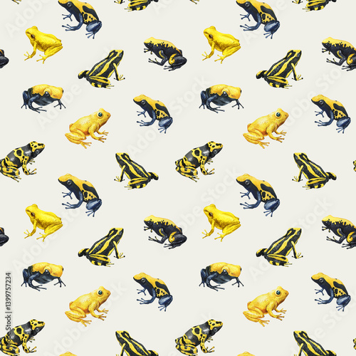 Watercolor seamless pattern with yellow and black poison frogs on Beige background for tropical wildlife decoration