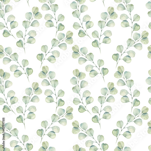 Watercolor seamless pattern witn eucalyptus branch. Hand drawn illustration. Floral repeat print on white background