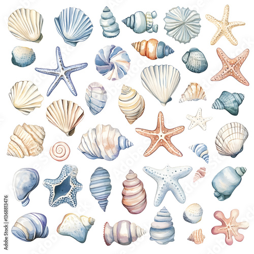 Watercolor Seashells and Starfish Collection on Transparent Background
