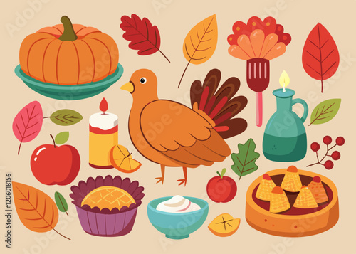 Watercolor set for thanksgiving day: falling leaves, pumpkins, sweater, hat, candles and other.