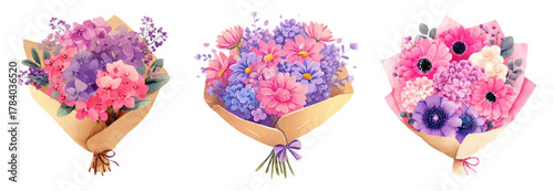Watercolor set of romantic bouquets of flowers in a vase. Floral bouquets in pastel pink tones with hydrangea, ranunculus, peonies, asters and others. Cute flowers for Mother's Day, March 8, etc.