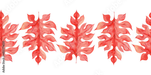 Watercolor set of seamless border with stylized red acanthus leaves
