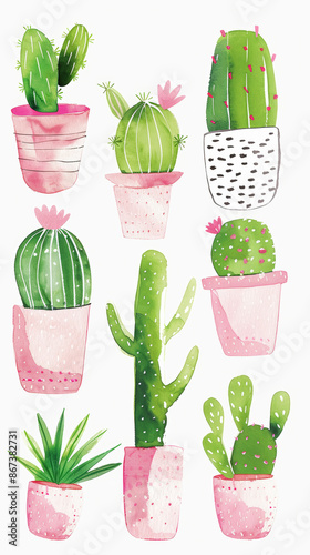 Watercolor set of trendy abstract cacti in beautiful pink pots in pastel colors, clean white background. Generative AI