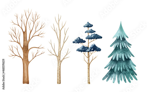 Watercolor set with stylized trees: fir-tree, pine, bare foliar trees isolated on white background. Cartoon hand drawn clipart. Nursery illustration.