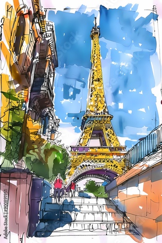 Watercolor Sketch Digital Illustration of Eiffel Tower in Paris.