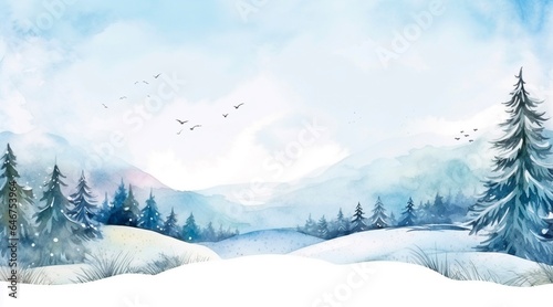 Watercolor snow-covered landscape in the daytime, mountain landscape with a pine forest and snow for winter background.