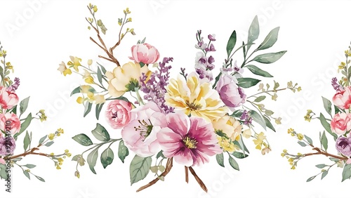 Watercolor spring floral bouquets, branches and leaves seamless pattern, hand painted on a white background