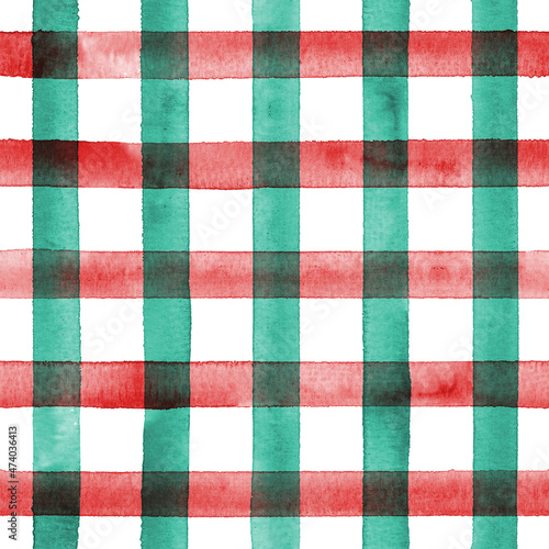 Watercolor stripe plaid seamless pattern. Red green stripes on white background