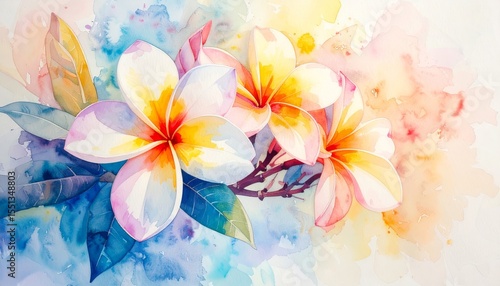 watercolor style, Frangipani flower in watercolor, vintage pastel tones, dreamy vintage hues background.