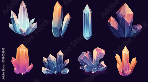 Watercolor style illustration presents an array of colorful crystals with faceted and sparkling textures against a dark background.