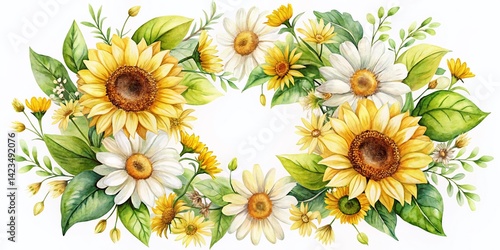 Watercolor Sunflower & Daisy Wreath, Circular Floral Design, Botanical Art, Summer Flower Arrangement, Greeting Card