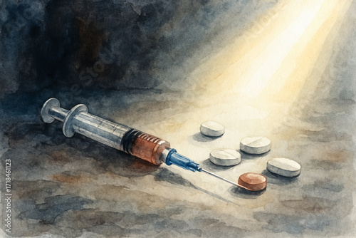 Watercolor syringe and pills on dark background with dramatic lighting. concept of addiction, dependency, health risk.
