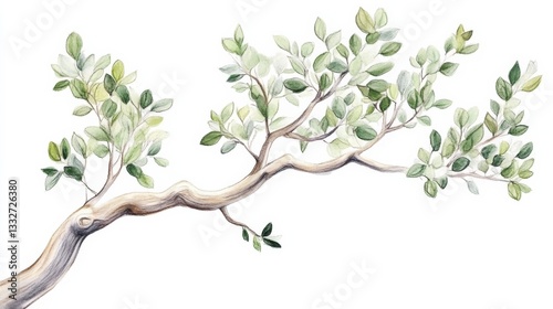 Watercolor Tree Branch Detailed Composition, Lush Green Foliage, Serene Nature Concept, Botanical Illustration Botanical Art, Watercolor Painting