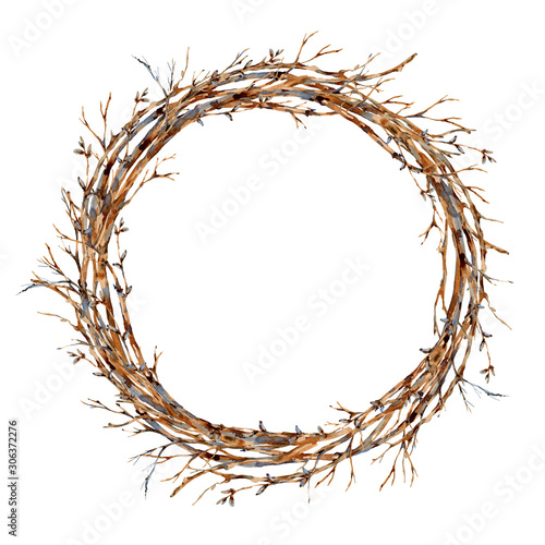 Watercolor tree branches wreath, vintajge botanical round frame for greeting card isolated on white background