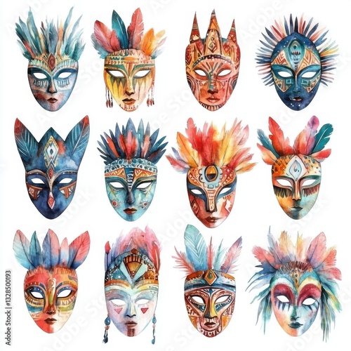 Watercolor tribal bohemian collection set. Collection of Watercolor Tribal Masks with Feathers