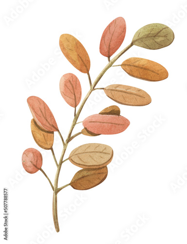 Watercolor twig with brown leaves. Floral illustration. Izolated on white background.