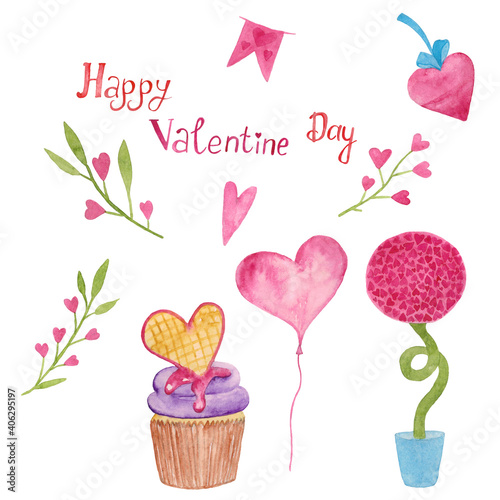 watercolor valentine's day set of illustrations blanks hand drawn heart tree cake lettering for greeting cards printing on white background