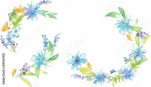 水彩のベクターフラワーフレーム。水彩タッチで描いた花と草木のウエディングフレーム。水彩の花束。Watercolor vector flower frame. Wedding frame of flowers and plants with watercolor touch. Watercolor bouquet.
