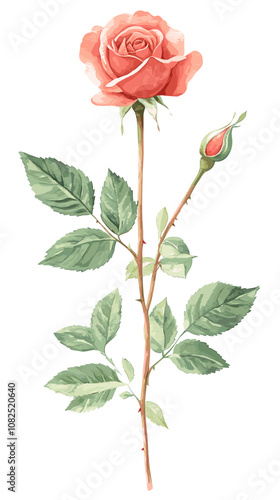 Watercolor vector illustration of beautiful Single-headed seasonal rose with leaves isolated on a white background flat svg