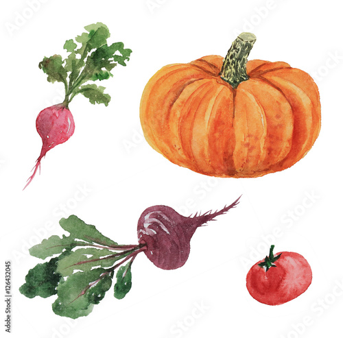 Watercolor vegetables - orange pumpkin, red tomato, pink radish, beetroot