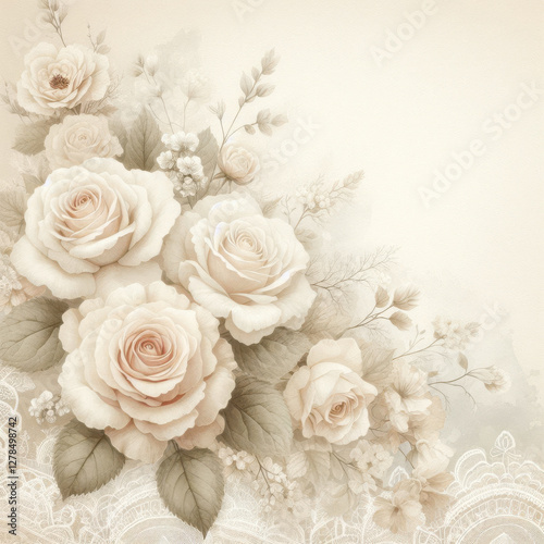 Watercolor vintage ivory roses rustic lace and had writing texts, Scrapbook paper, Wedding background