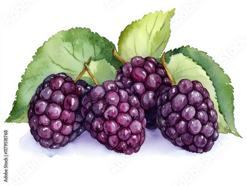 watercolor Watercolor illustration of dark purple mulberries with green leaves isolated design on white background