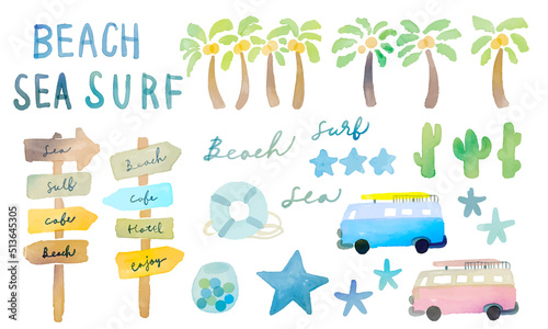 水彩画。水彩タッチの西海岸風イラストセット。Watercolor. West Coast style illustration set with watercolor touch.