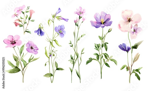 Watercolor wild flower clipart, pink and purple flowers on a white background, in different angles and poses.