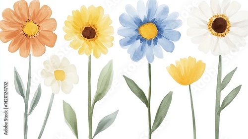 Watercolor wildflowers in a row daisies sunflowers and poppies in soft hues