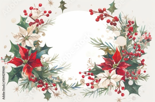 Watercolor Winter Floral Frame Featuring Holly and Mistletoe on a White Background