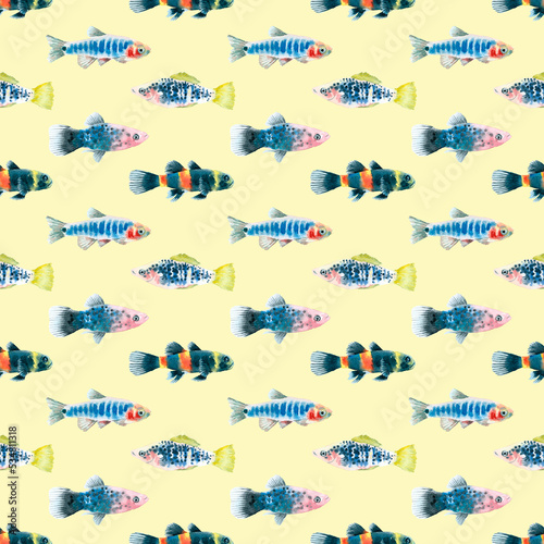 Watercolor yellow aquarium fishes seamless pattern illustration, colorful animal, sea, lake clipart, Nautical, ocean drawing, nursery hand-painted fish design, fabric,gift wrap,scrapbooking,wallpaper
