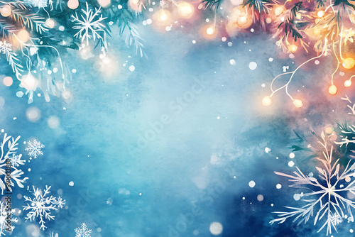 Watercolour Christmas background with delicate snowflakes and glowing fairy lights