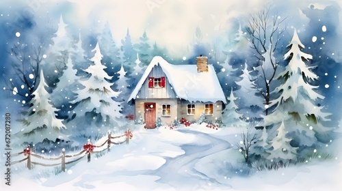 watercolour illustration of house in the winter wood
