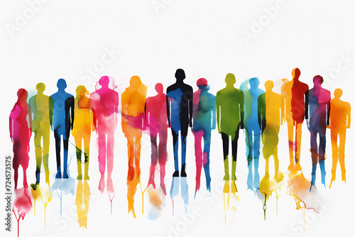 Watercolour painting of a diverse group of multicultural people standing together to show equality, bonding and togetherness, stock illustration image