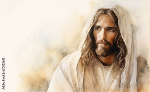 Watercolour pencil illustration of close up Jesus portrait. Peaceful and serene mood. Banner with copy space.