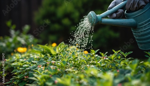 Watering plants in garden with can