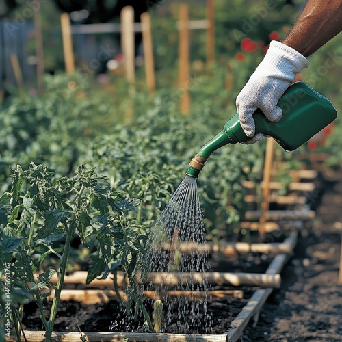 Watering tomato plants in a garden A gloved hand holds a green watering can, pouring water onto plants in raised beds