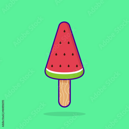 Watermelon Popsicle on Stick. Fruit Ice Cream on Green Background. Sweet Frozen Cute Ice Cream on Stick in Cartoon Style. Isolated Vector Illustration