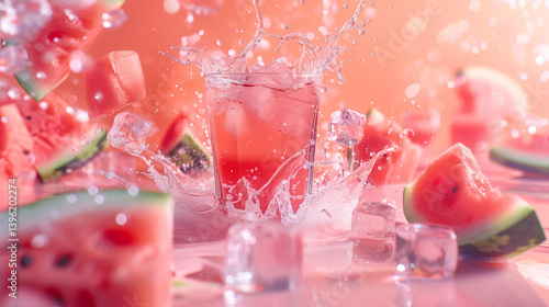 Watermelon soda splashing out of a glass, surrounded by ice cubes and watermelon slices, watermelon soda, refreshing summer drink