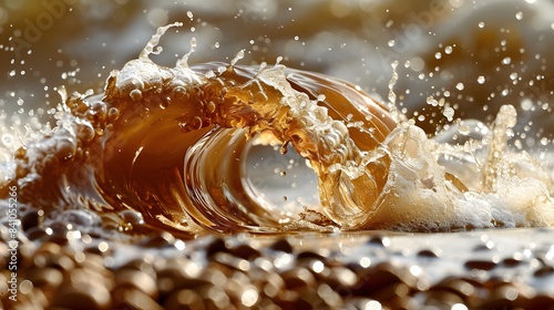 wave of splashing coffee with coffee beans, isolated on white