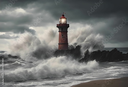 waves breaking around a lighthouse on the water's edge