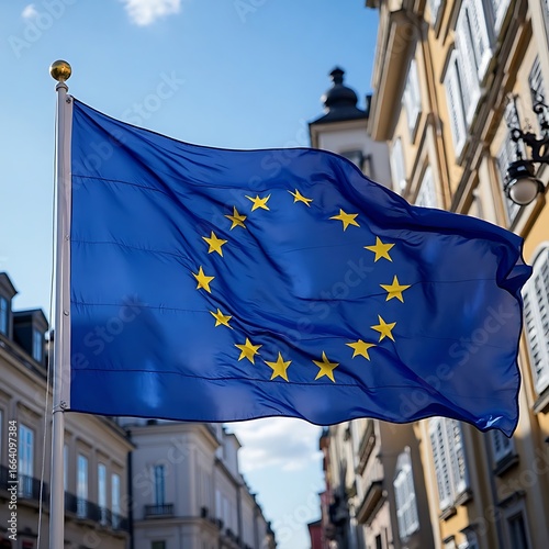 Waving Blue Flag with Yellow Stars in City Street