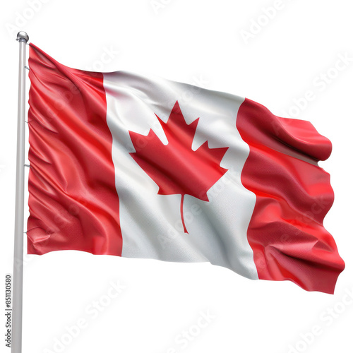 Waving Canadian flag on a flagpole against white background, showcasing national pride and iconic red maple leaf design.