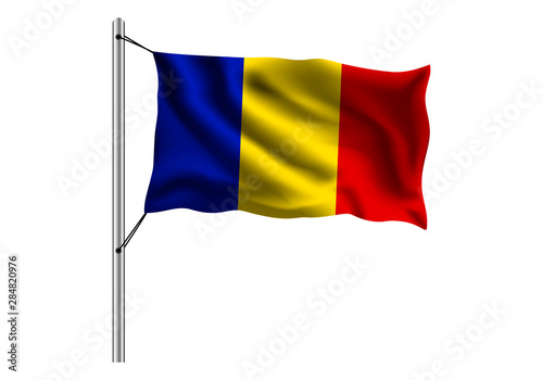 Waving Romania flag on flagpole on isolated background, flag of Romania, vector illustration
